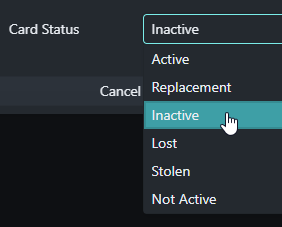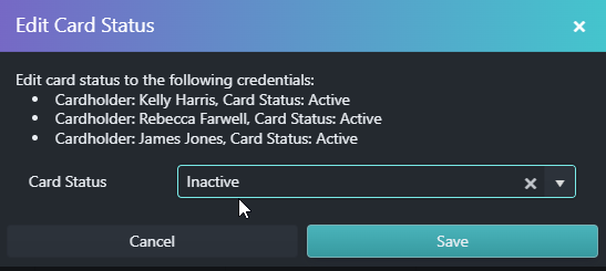 Note: If your system uses PXL controllers and you are changing the status of several credentials, it will take a few minutes for the credentials to be updated on all the PXL controllers.