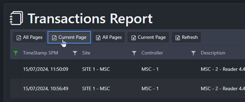 Borealis gives you the option to export report information to an Excel spreadsheet or a PDF. The transaction reports screen allows you to export the current page or all the listed pages. Typically reports are printed after you have filtered the data to only include specific system data.