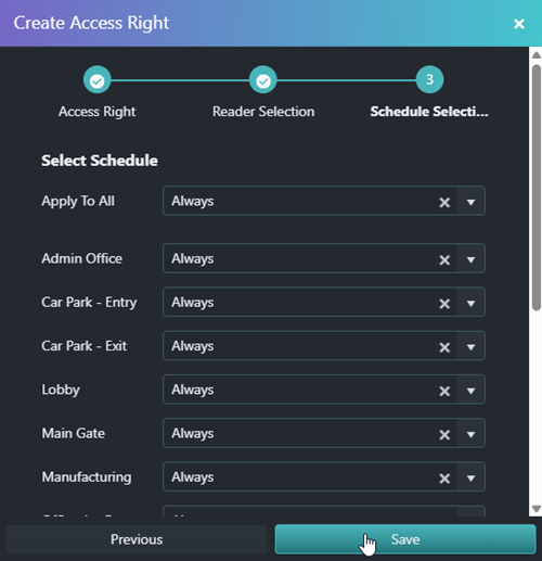 - Select the readers to add to the access right - this determines which readers the credentials will be able to gain access. In this example, I have clicked on the Toggle All button to select all of the readers on this site.