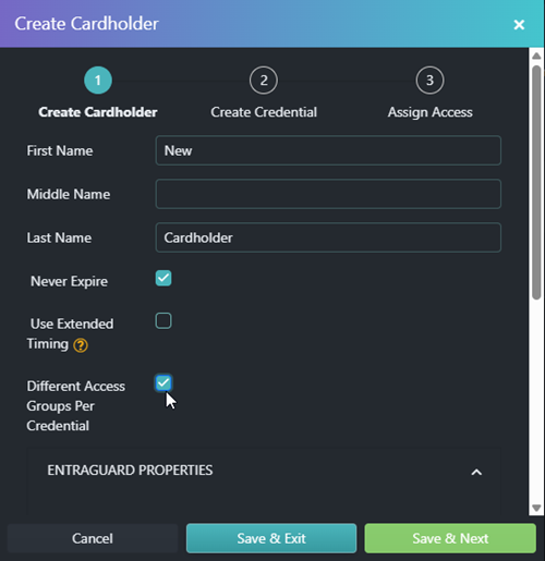 - If the cardholder will have multiple credentials decide if you wish each credential to have its own access rights.