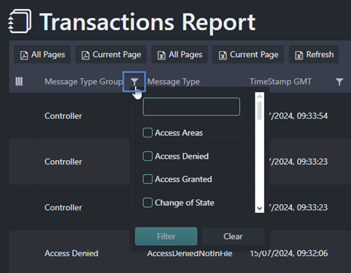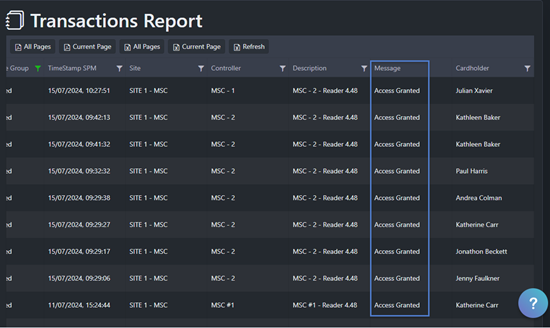 Transaction reports provide you with a list of access control system events and a time and date stamp of when and where the event occurred. A system event is any event generated by the access control hardware, such as access granted and access denied events, door opened and door closed events, door locked and unlocked events, reader online and offline events (for supervised readers) and network updated related events.